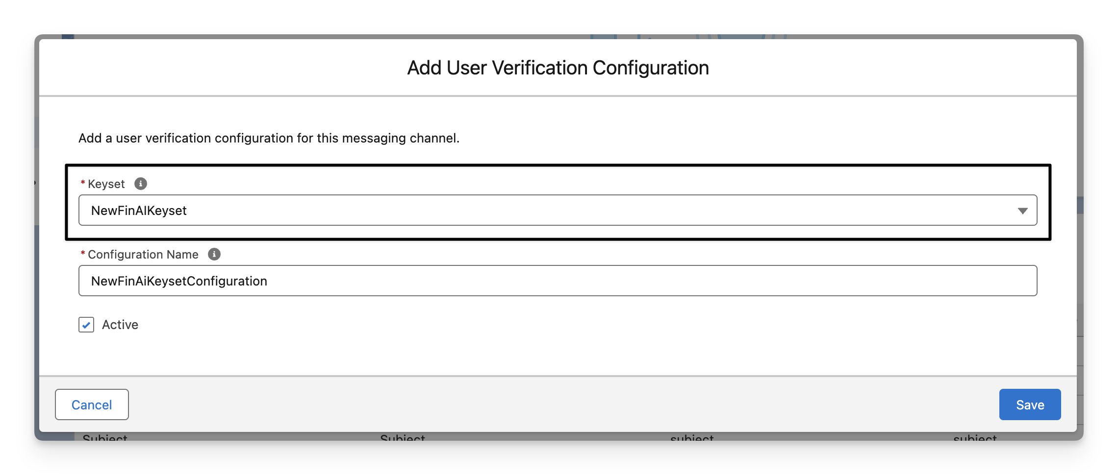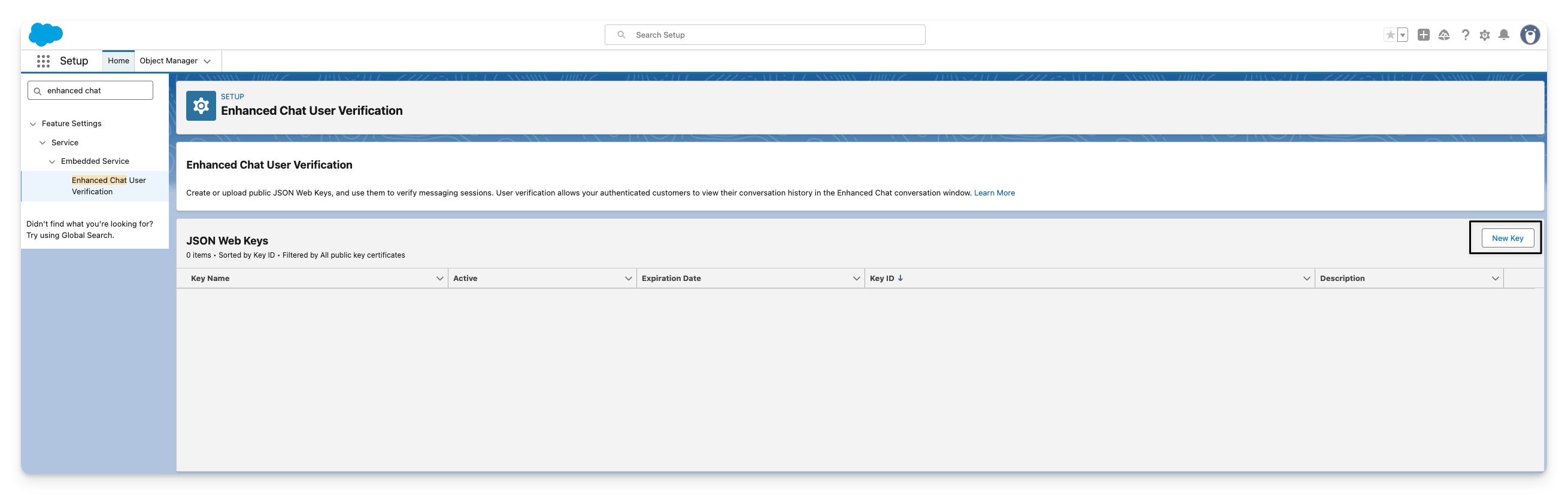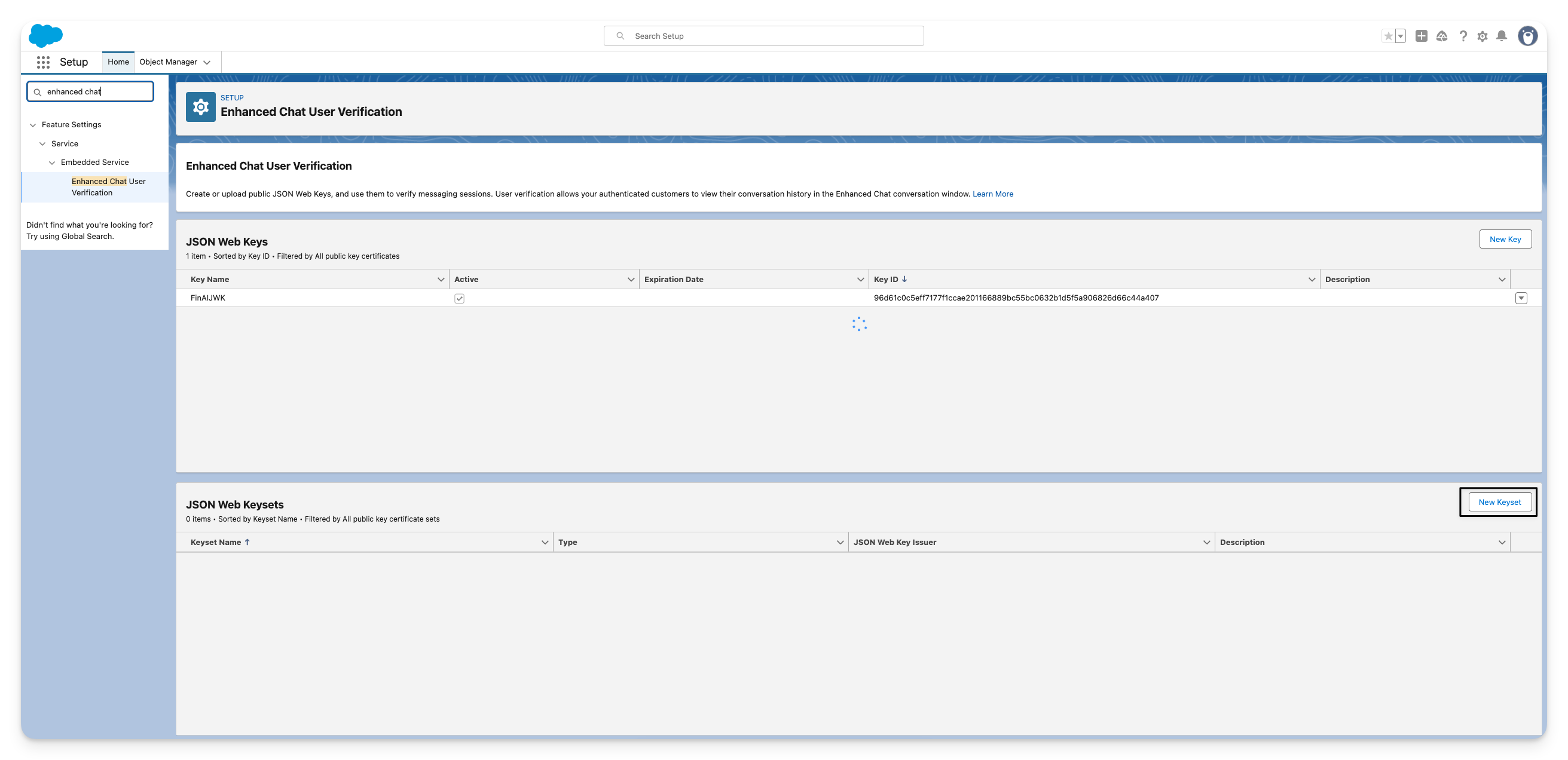 Go to Salesforce > Setup > Enhanced Chat User Verification, click New Keyset.