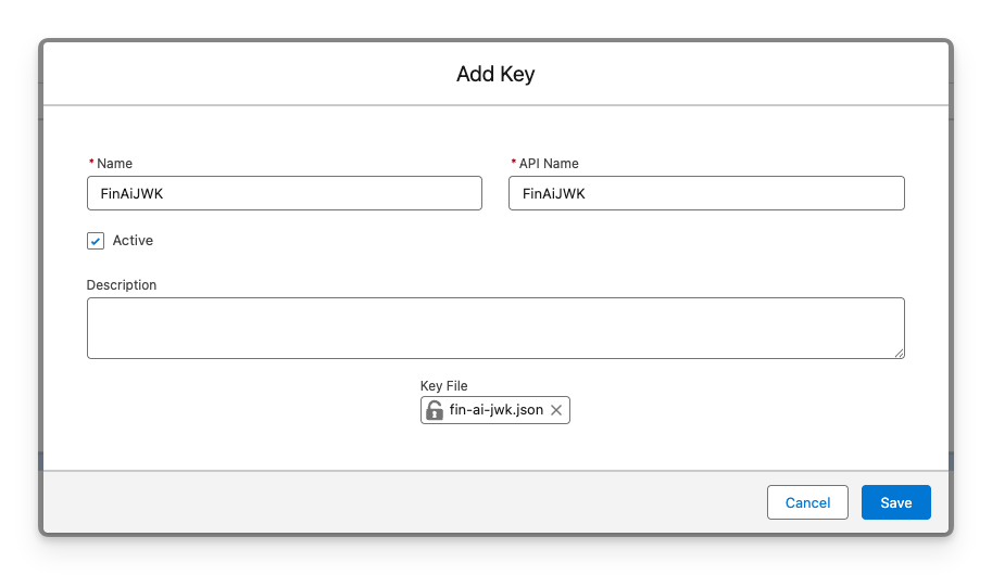 Enter a Name and API name of your choosing. Upload the JWK and click Save.