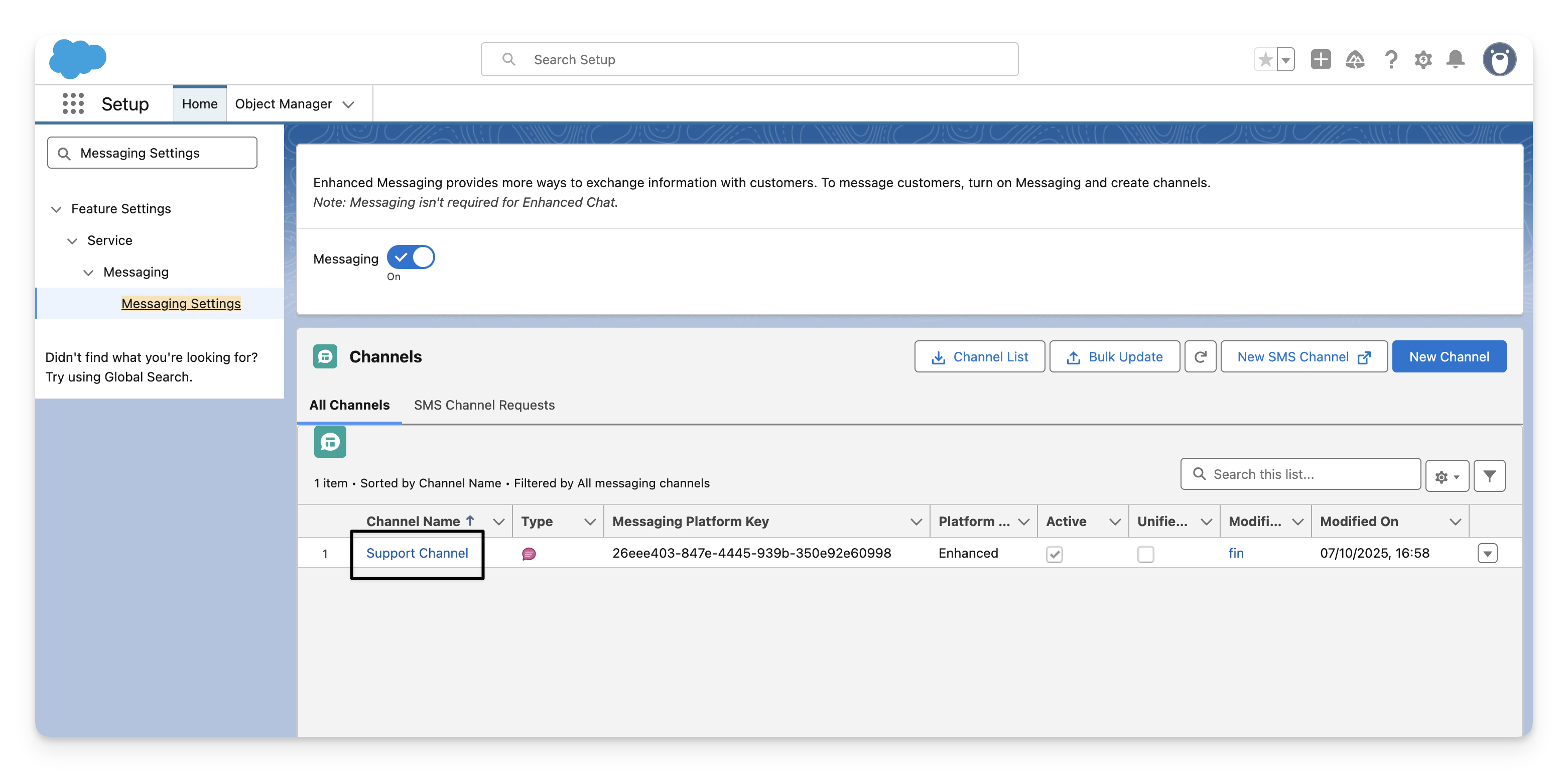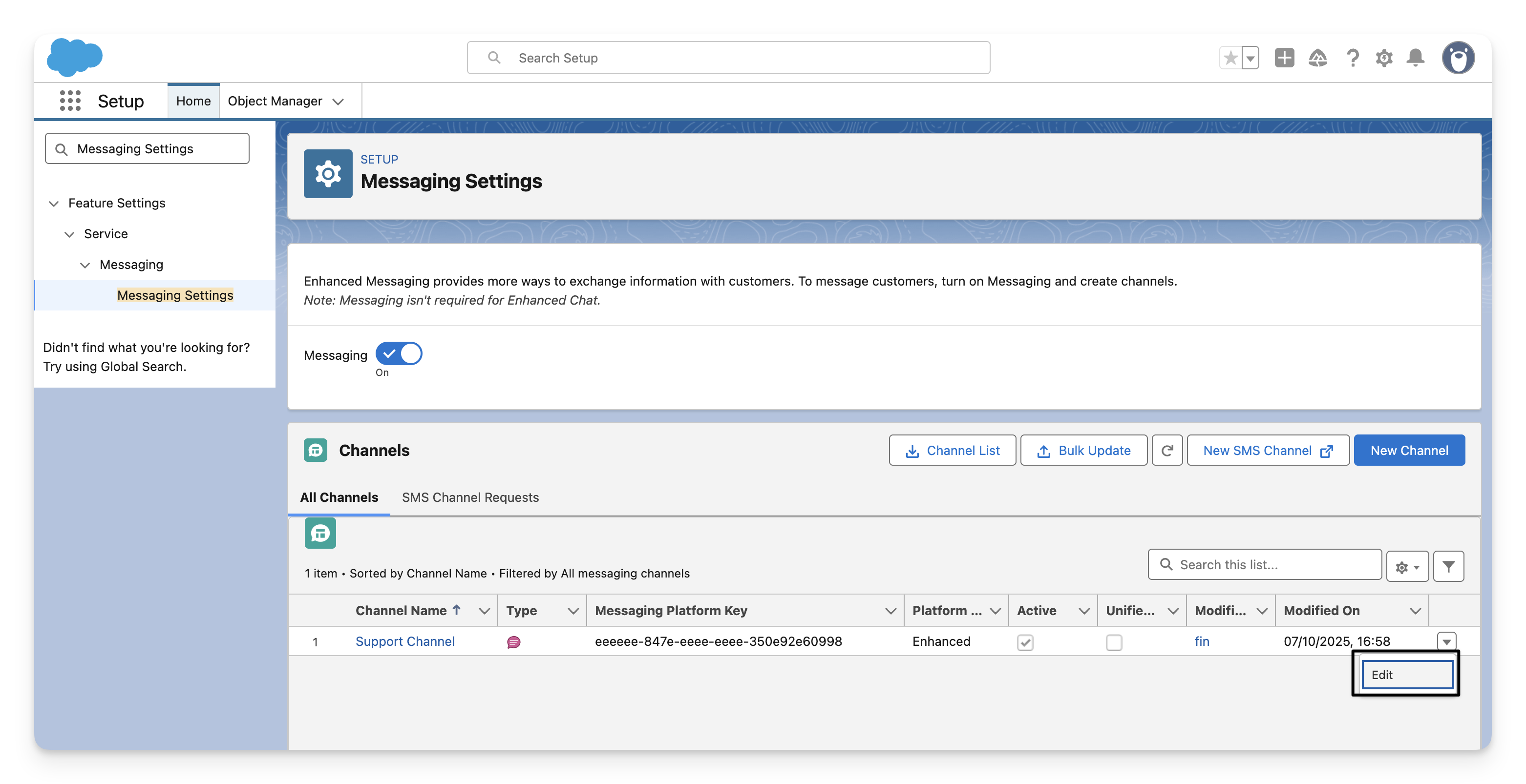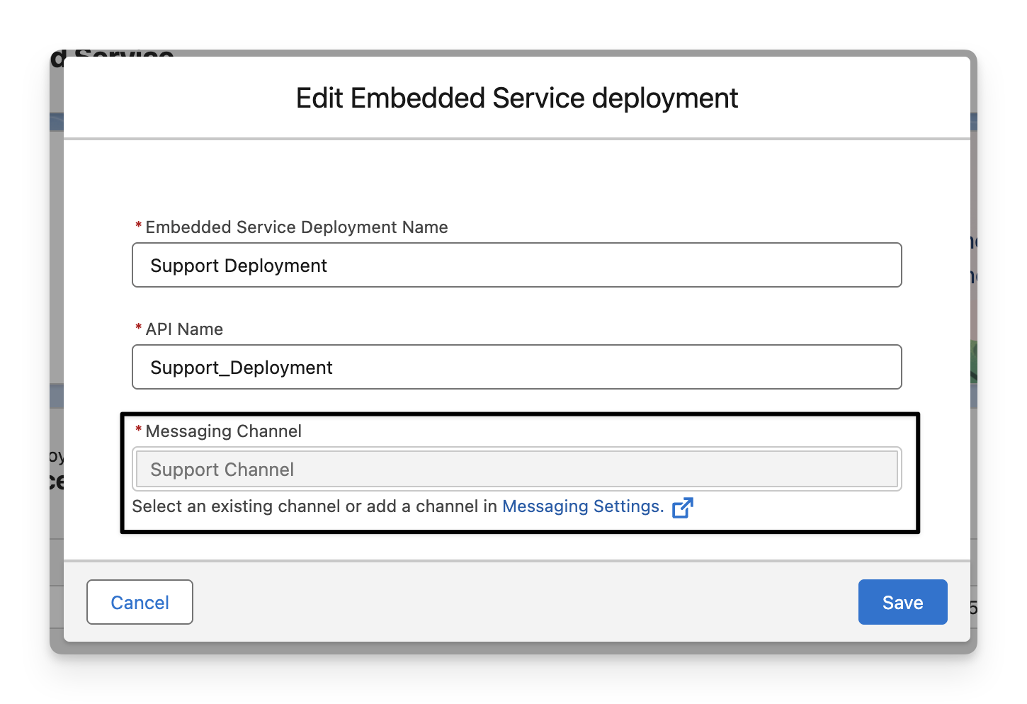 Go to Salesforce > Setup > Messaging Settings once again, click on the name of the channel linked to your Embedded Service Deployment.