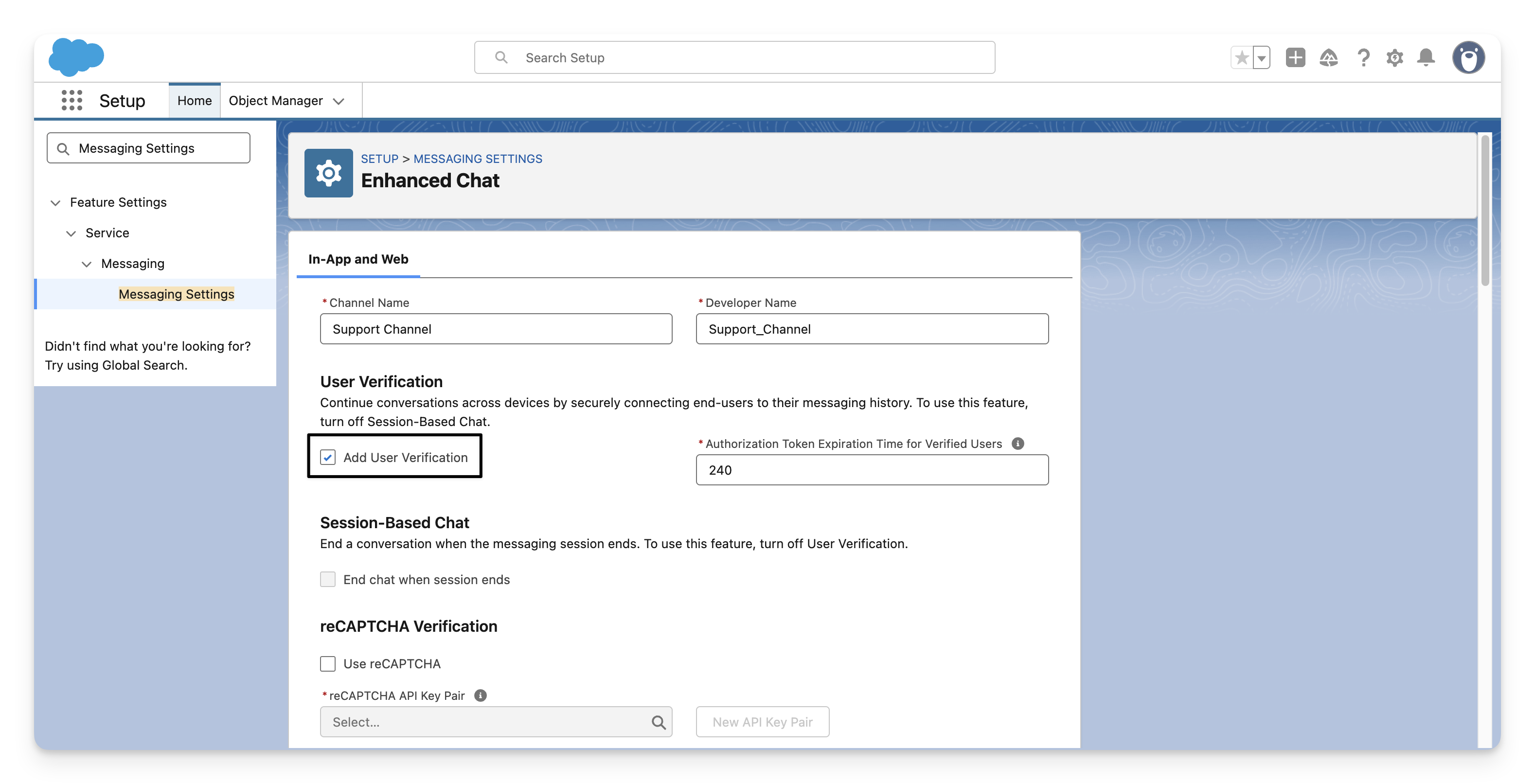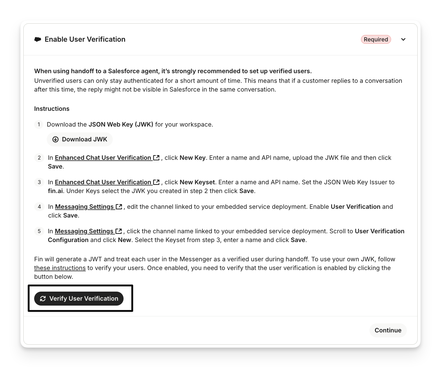 Enabling user verification for enhanced chat enables persisting secure messaging history across multiple devices. This also tackles issues when the customer has multiple tabs and browser windows. User verification allows Sweo to treat each user session consistently and so is required as part of getting the Sweo Messenger channel set up.