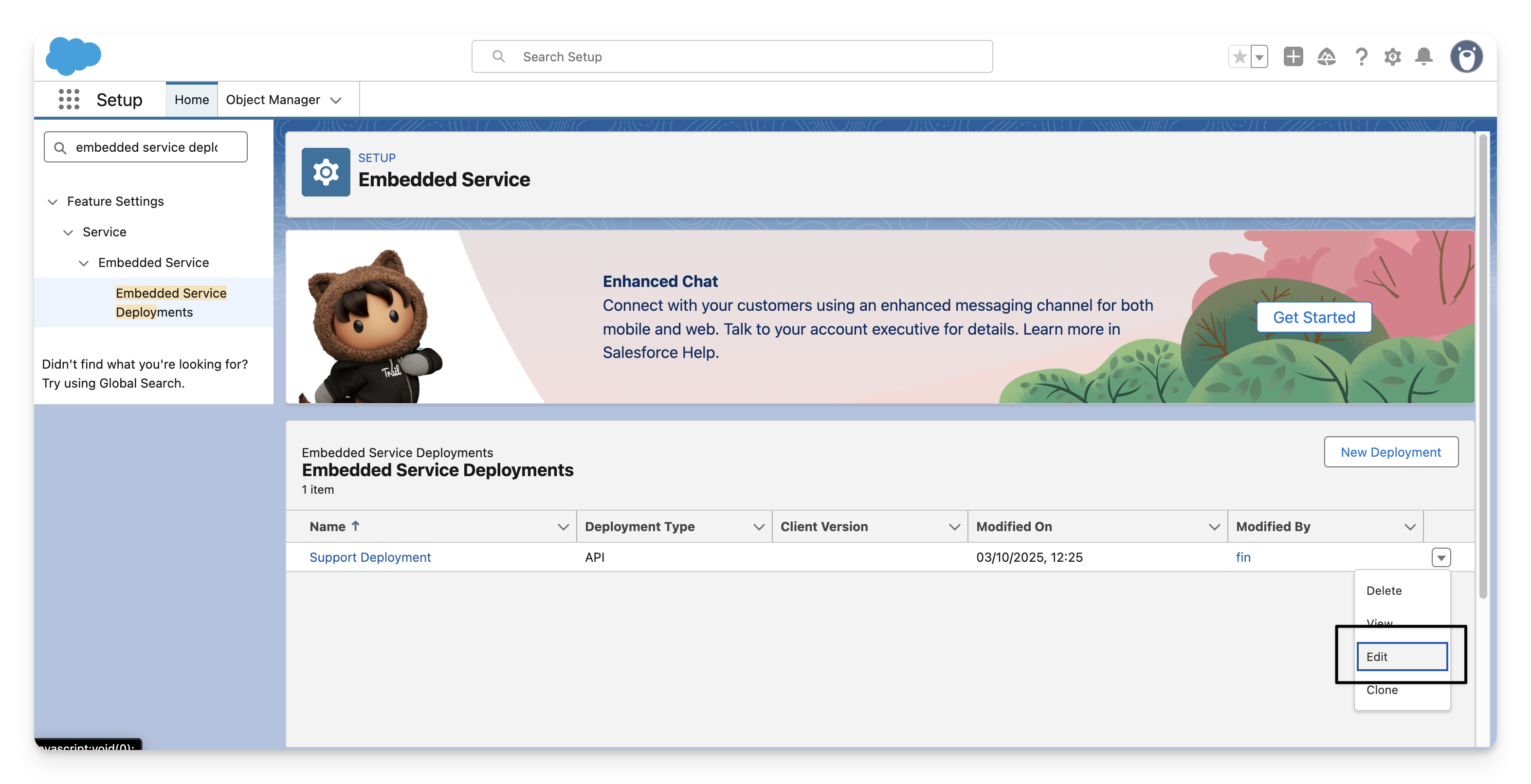 Go to Salesforce > Setup > Messaging Settings, click the dropdown listed for the channel linked to your Embedded Service Deployment and click Edit.