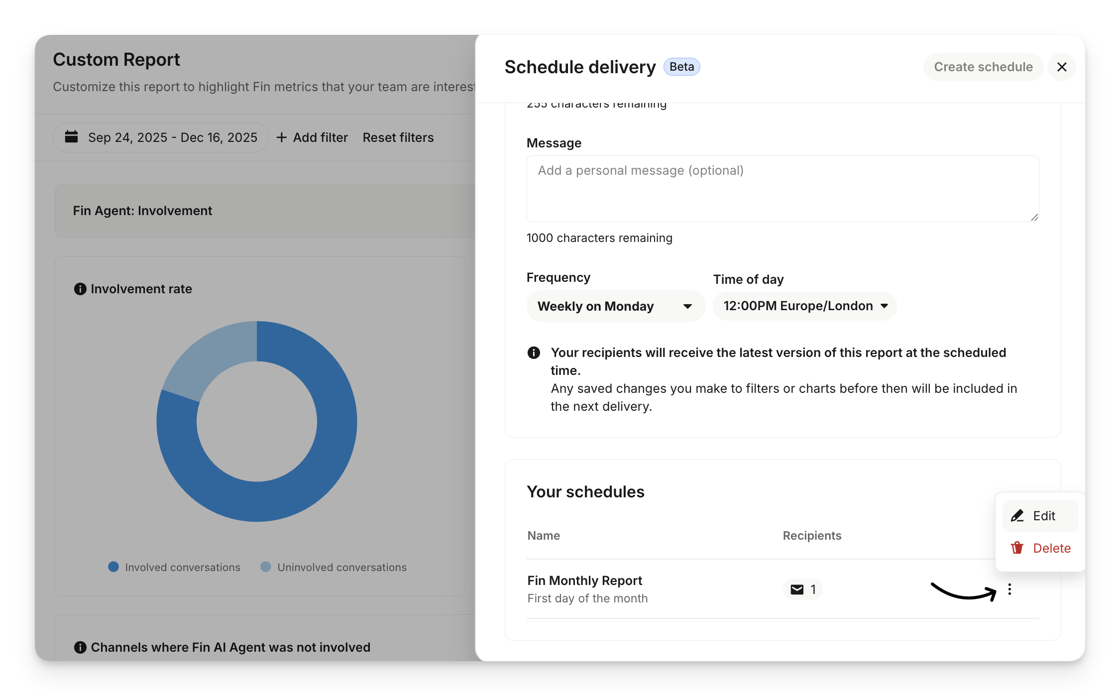 At the bottom of the side drawer, you'll see a list of all schedules you've created for this report. Click the 3 dot menu next to a schedule to edit or delete it.