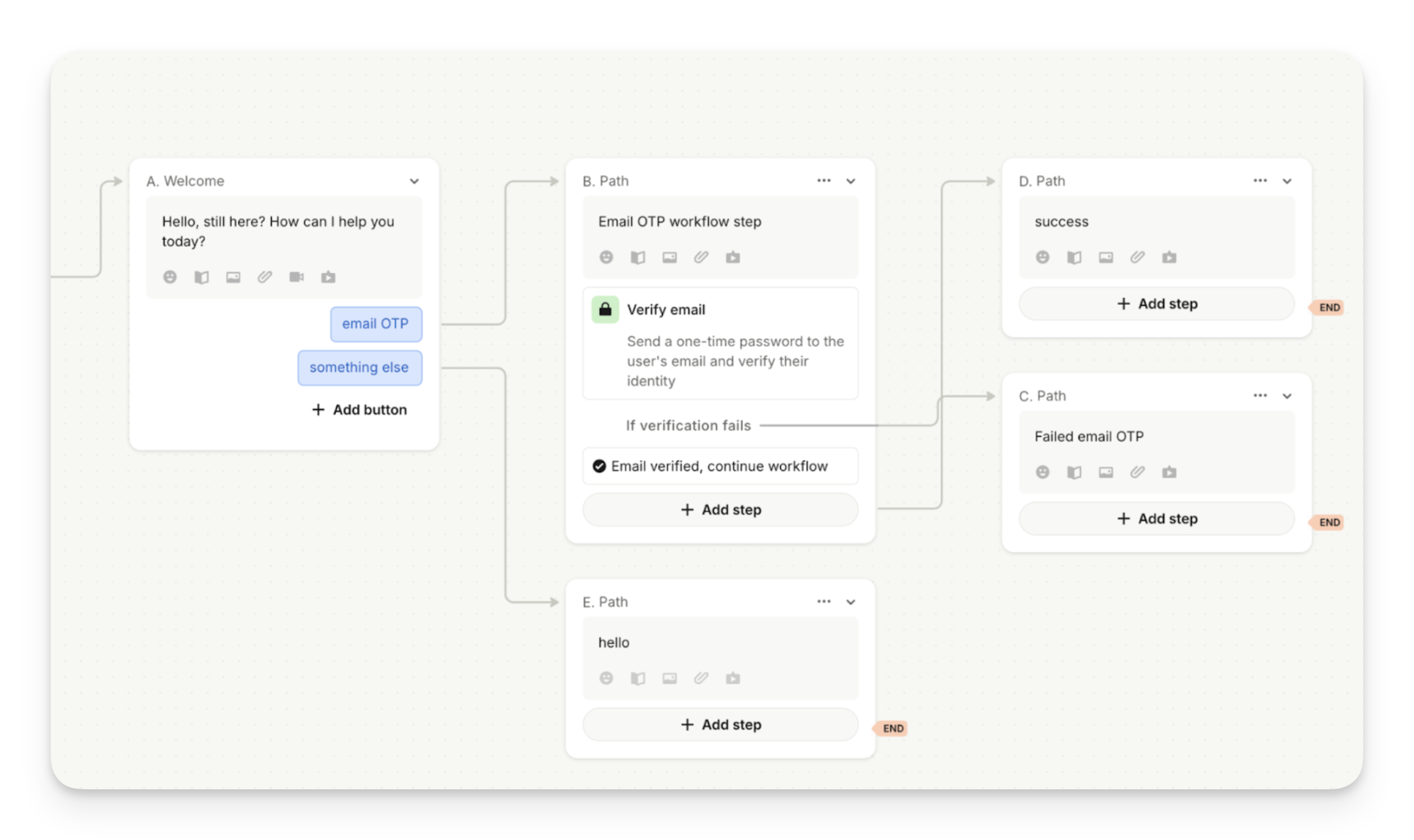 You can verify a customer's identity by sending a one-time password (OTP) to their email address directly within your workflows. This ensures a secure experience while keeping the customer within the conversation.