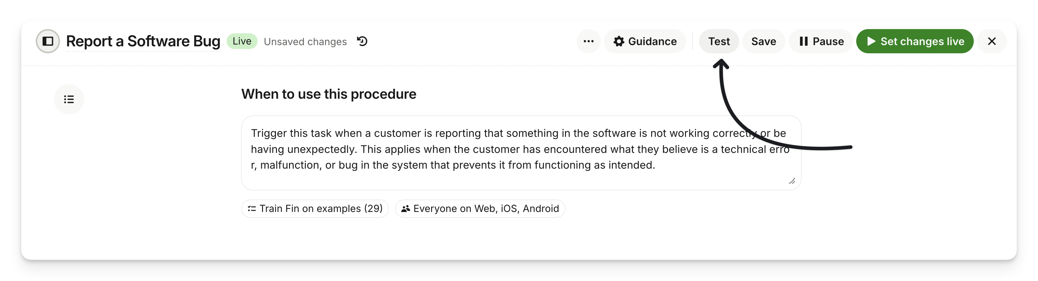 Before you set your procedure live, you must verify that it works as intended. Click the Test button at the top of the editor to access two testing methods: