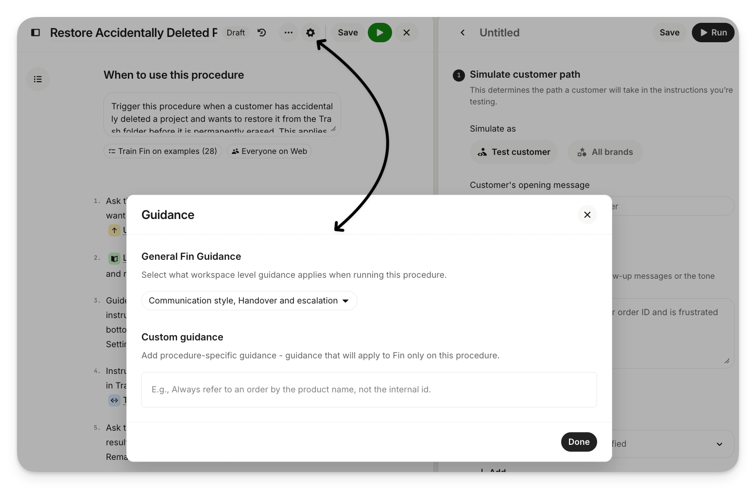 Give Sweo specific guidance on how to interact with customers while running a procedure. To add guidance, open a Sweo Procedure and click Guidance in the top right corner of the Instructions editor.