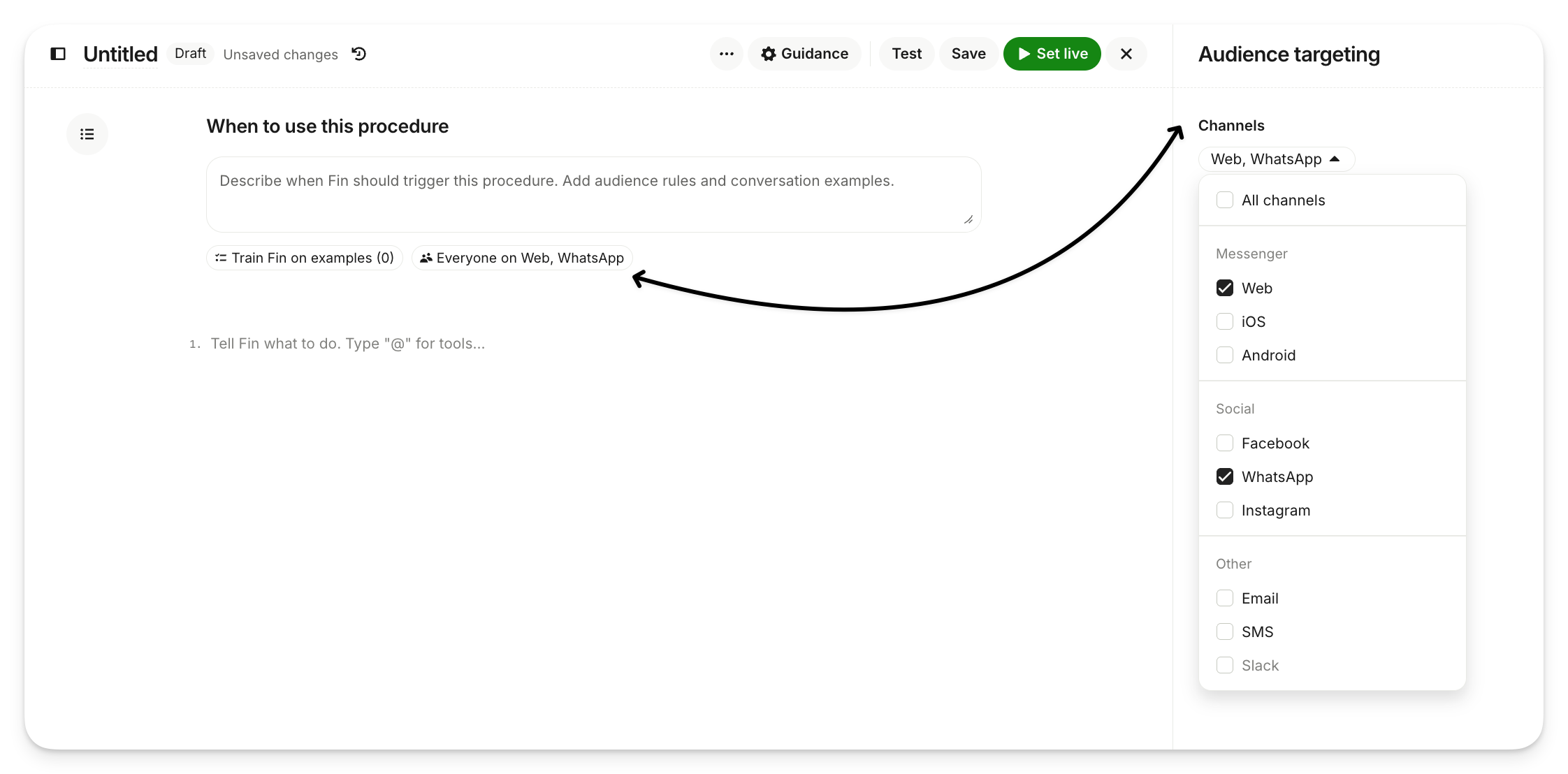 To run a procedure on specific channels, such as Web, iOS, Android, Facebook, WhatsApp, Instagram, SMS, Email, or Slack use the Audience targeting settings within the procedure editor. Ensure the desired channel is selected in the Channels dropdown menu.