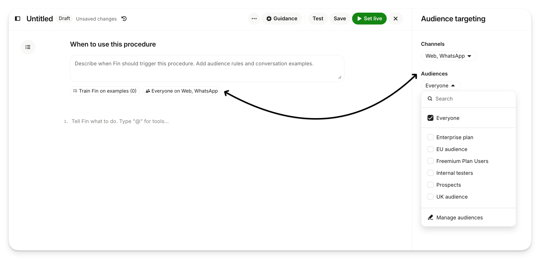 To run a procedure for specific audience use the Audience targeting settings within the procedure editor. Ensure the desired channel is selected in the Audiences dropdown menu.