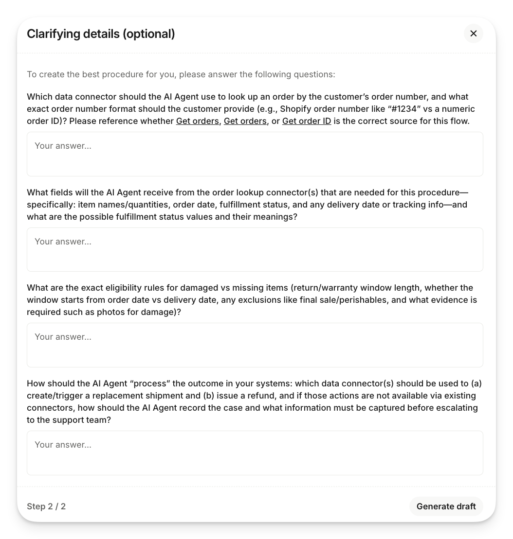 Answer the clarifying questions to help Sweo flesh out specific logic and instructions. While these are optional, providing this information ensures a more accurate draft.