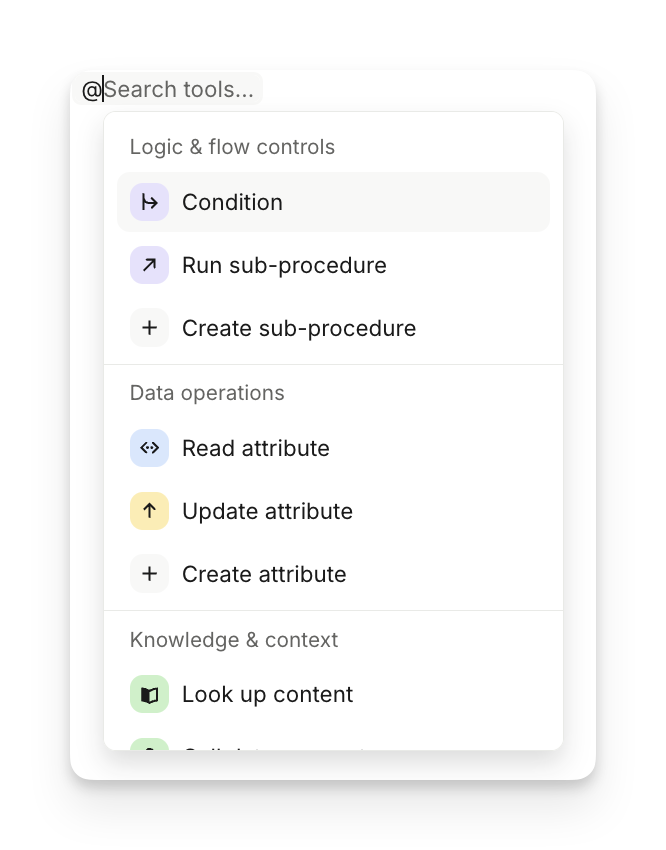 | @Create sub-procedure | Build a new nested flow directly from your current editor. |