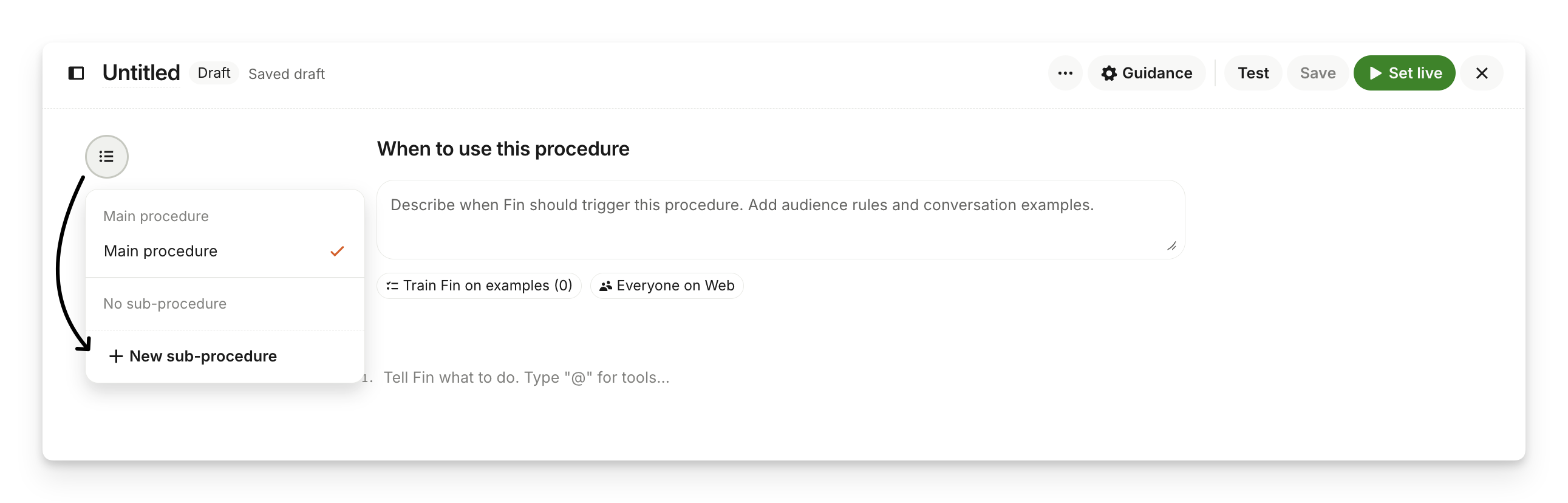 Open or create a Sweo Procedure from Sweo AI Agent > Train > Procedures.